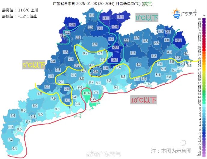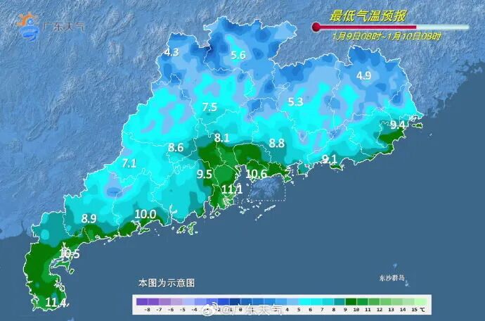 未来几天冷空气活动依旧频繁,“阿冷”的影响还会持续。9日,影响广东的冷空气(地面冷高压)逐渐减弱,白天阳光和煦,最高气温有所回升,但早晨晴空辐射效应显著,早晚依旧寒冷,粤北和珠三角北部会出现大范围5℃以下的低温,部分市县有霜冻或冰冻,昼夜温差较大。