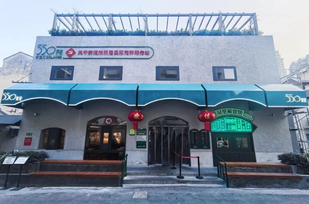 550弄虽只有200米,却业态丰富:社区食堂、党群服务站、成套改造后的老公房、老字号包子铺、杂货铺,还有沪上知名文创商业体“嘉善老市”。如何在统一风貌中保留业态个性,避免“一刀切”改造,是更新工作的关键。更新团队的办法是逐户沟通、协商共建。