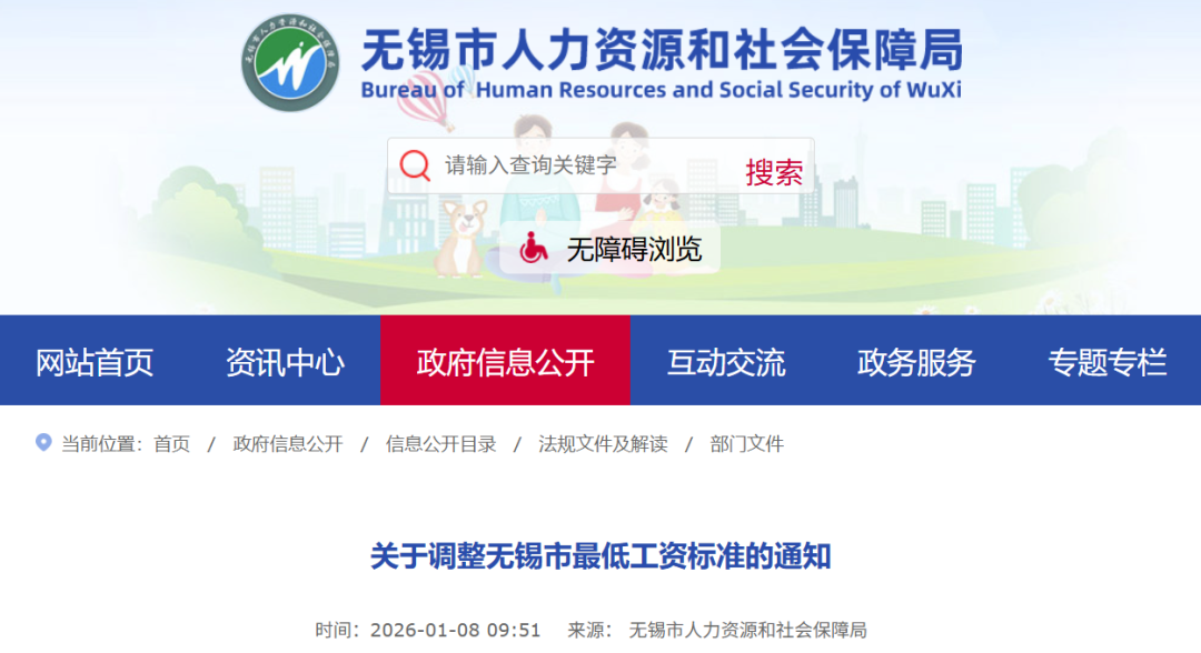 《关于调整无锡市最低工资标准的通知》(锡人社发〔2026〕2号)已在无锡市人力资源和社会保障局官网发布,点击“阅读原文”可下载查阅。