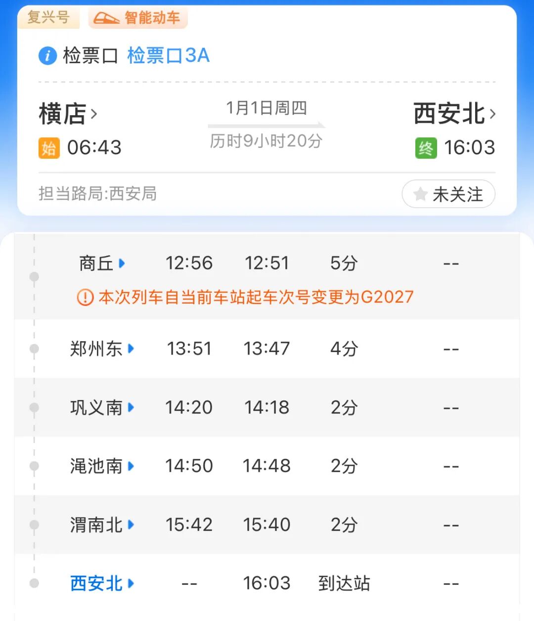 而从商丘站继续开往终点站西安北站时,方向变为远离北京,属于下行,车次就会在商丘站切换为单数G2027。