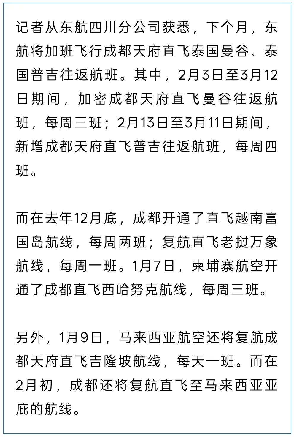 加密直飞航线!成都往返东南亚等多地航班将增加