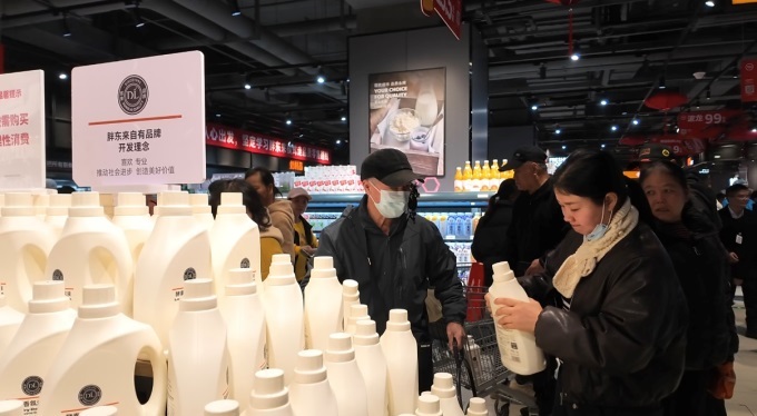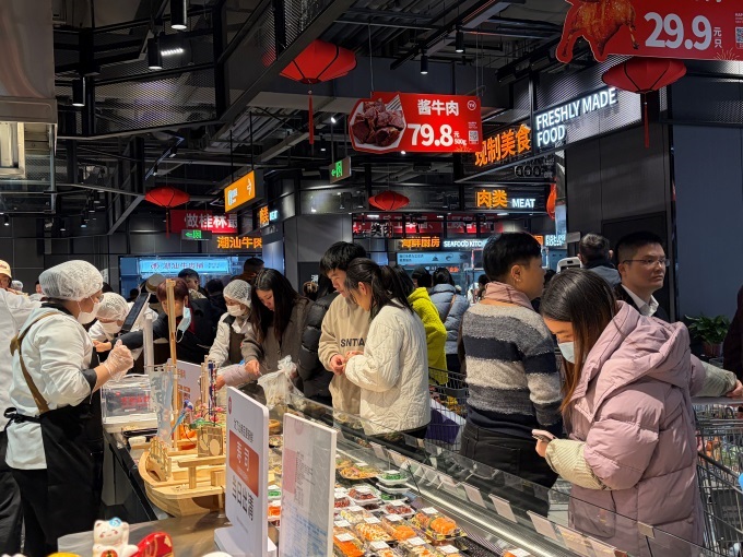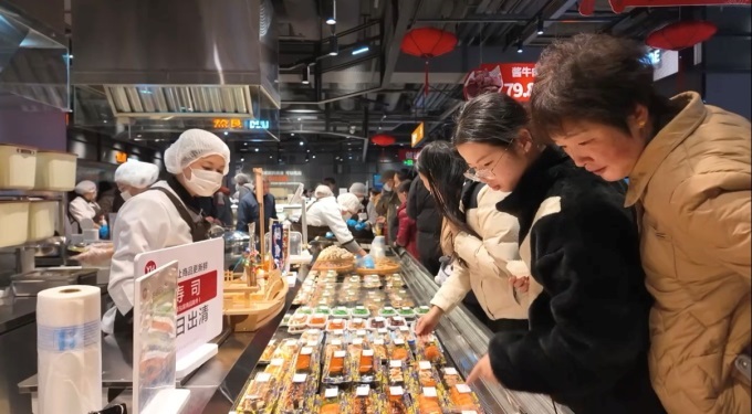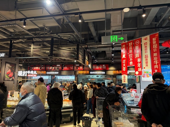 熟食烘焙区香气四溢,熟食档口有现制披萨、捞汁小海鲜等;烘焙区有经典欧包及草莓奶油盒子蛋糕等新品。门店搭建“大牌尖货、永辉定制、品质永辉”商品体系,永辉自有品牌如洁面柔巾、古法花生油等受青睐;永辉定制商品坚持优价优质,如与金晔合作的山楂条。还设“胖东来自有品牌专区”,DL果汁、海鳗鱼干等齐聚。临近春节,门店打造“新年爆款诚意直降”场景,备齐鲜猪排骨、智利车厘子等年货。