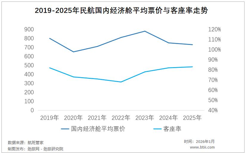 2024年国内航司经济舱平均票价同比下降12.7%;2025年延续低票价策略,全年经济舱平均票价为738元,同比下滑3.1%,呈现“旅客多但利润少”的局面。