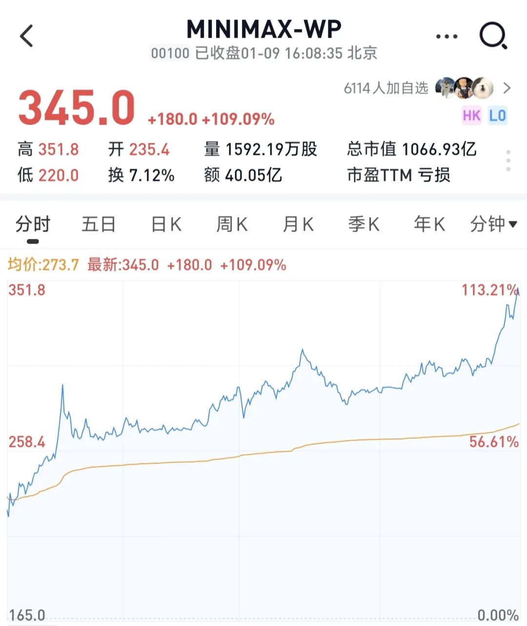 1月9日,MiniMax正式登陆港交所,开盘后股价一路走高,最终收涨109%,市值冲破千亿港元。
