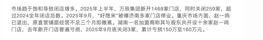 截至2025年底,黑猫投诉平台上鸣鸣旗下品牌累计投诉超2000条,发霉、异物等问题频发。曾被“1.5年回本”吸引的加盟商遭遇现实困境,湖南某加盟商称合开的十余家新店多数亏损,已关停三家,损失超百万元。公司闭店率从2022年的约0.7%升至2024年的1.9%。