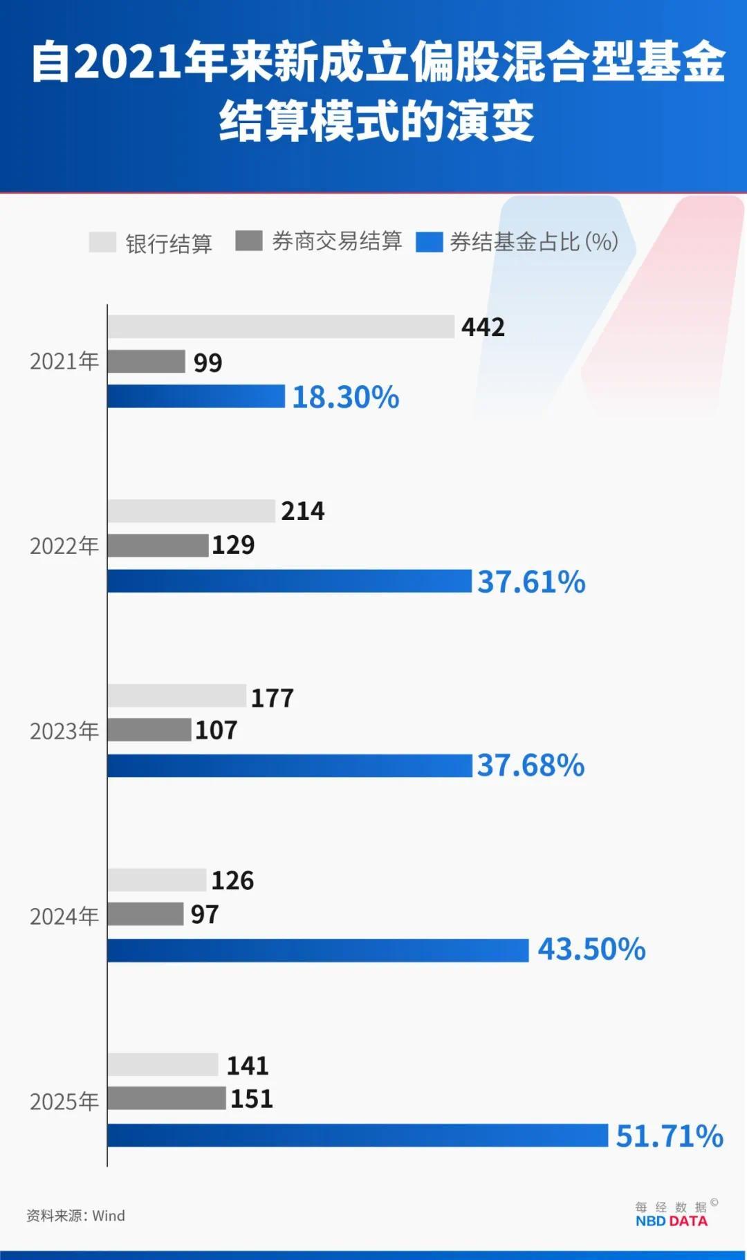 Wind数据显示,2021到2025年,新成立的偏股混合型基金选择券结模式的比例从18.3%升至51.71%。同期,传统银行结算模式的新发产品数量从442只降到141只,券结模式的从99只波动升至151只,2025年首次反超前者。