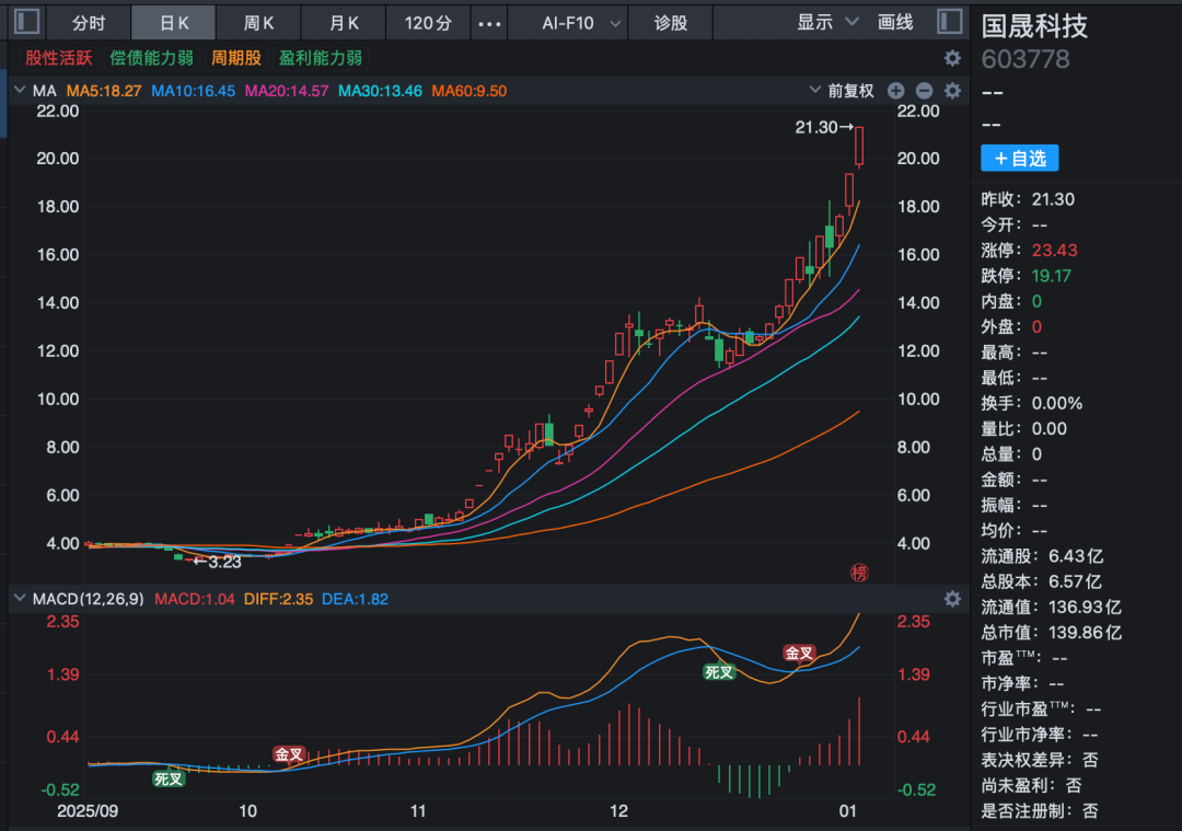 近期国晟科技股价表现强劲,2025年10月31日至2026年1月6日期间,公司股票5次触发股价异常波动、1次触及严重异常波动情形,累计涨幅达370.20%,最新股价21.3元/股,创下历史新高。基于此,公司依规申请自1月7日开市起停牌核查,预计停牌时间不超过3个交易日。