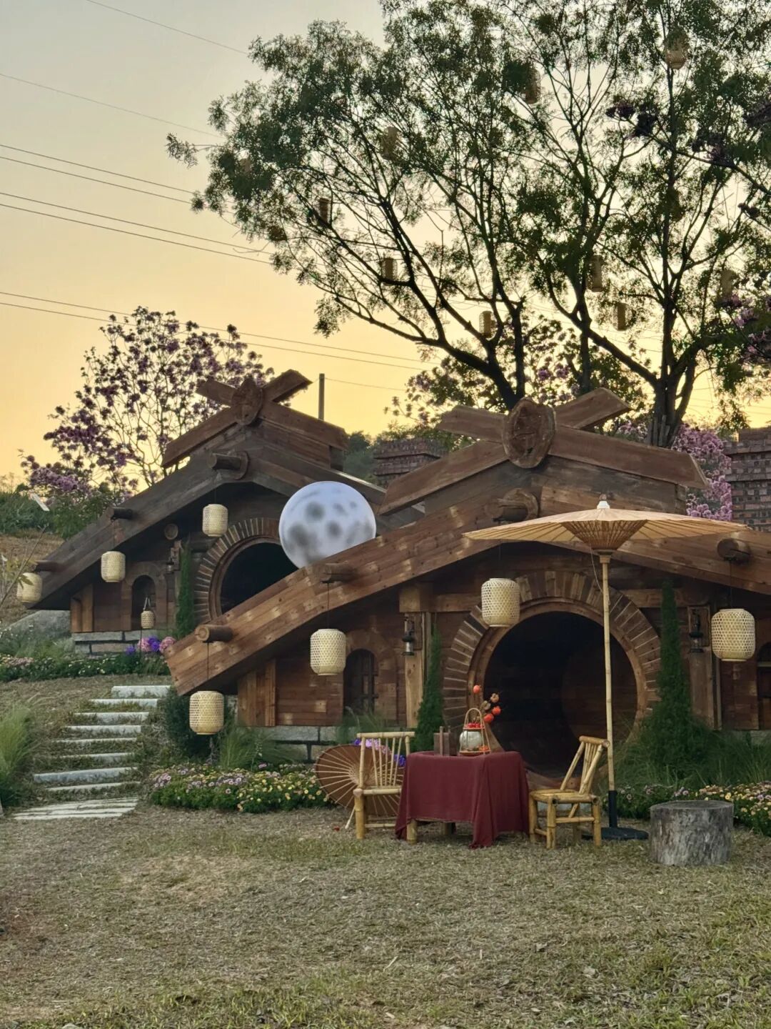 循着小径往上走,童话仿佛在此落地生根,一栋栋霍比特小屋映入眼帘。圆门彩窗,斜顶如笠,仿佛下一秒就会有霍比特人捧着蜂蜜酒推门问好。这里让童话故事不再局限于书页,而是在此处鲜活地呼吸、生长,等待着人们走进其中。