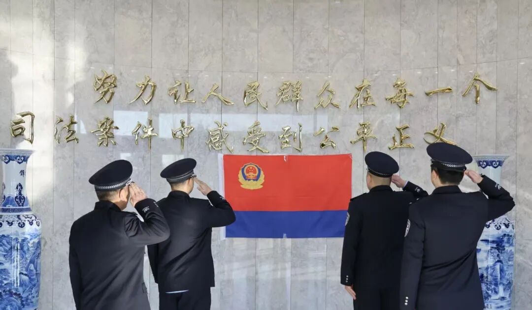 镜头记录下他们的身影:手持警旗并肩站立,身后是庄严肃穆的法院建筑,警徽在阳光照耀下闪耀着夺目光芒;面向警旗敬起标准礼,背后“努力让人民群众在每一个司法案件中感受到公平正义”的金色标语,不仅是他们的使命,更是对人民的郑重承诺。