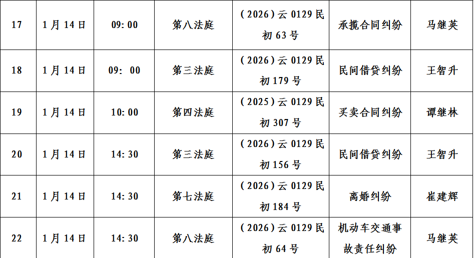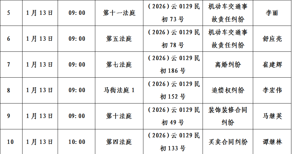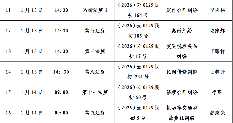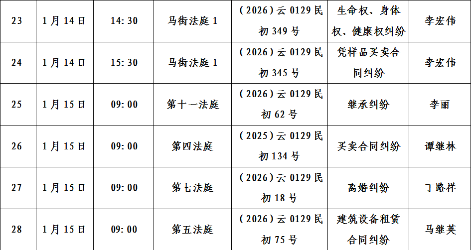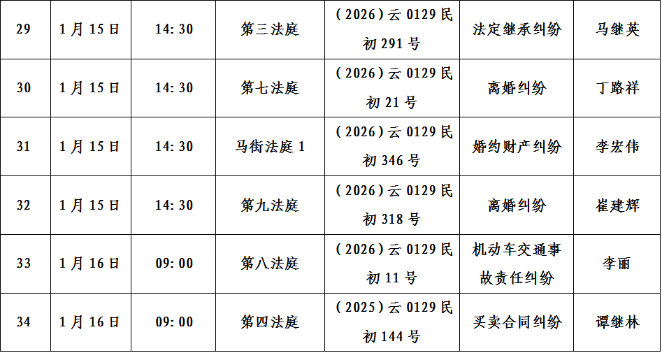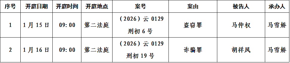 寻甸县人民法院2026年1月12日至1月16日开庭排期公告