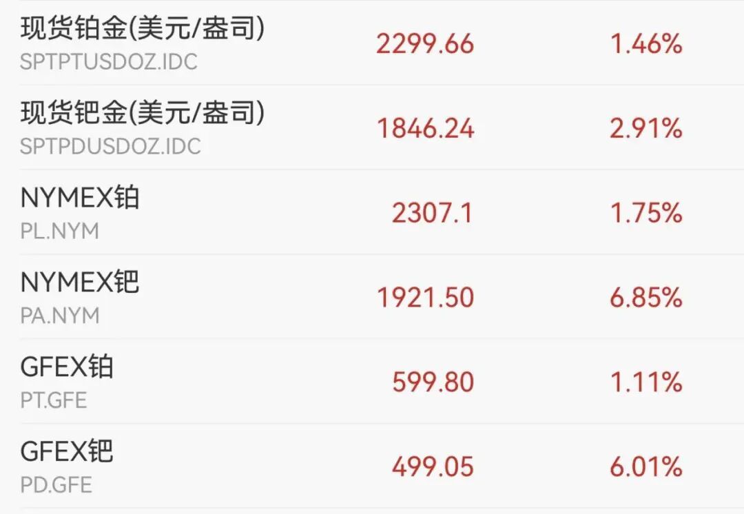 1月9日,广期所钯期货主力合约涨超6%,但此前曾连续两日跌停。NYMEX钯金主力合约同期涨超7%,报1924.5美元/盎司。