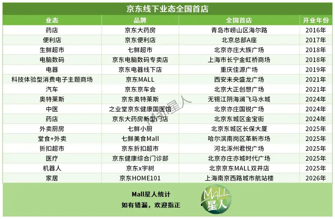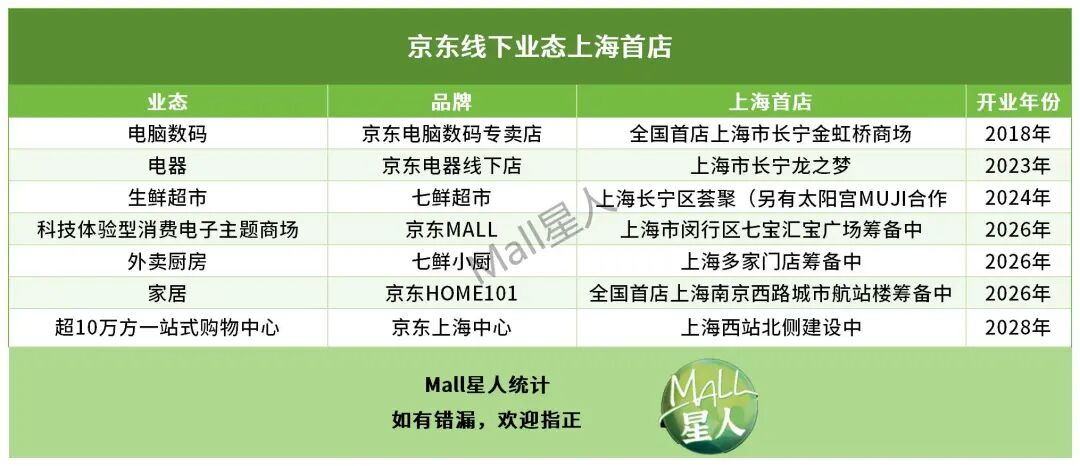 2023年起京东已在上海落地七鲜超市、京东电器线下店等,2026年还将开出七鲜小厨、京东MALL七宝汇报广场等,2028年上海西站十万方购物中心上海首店预计开业。