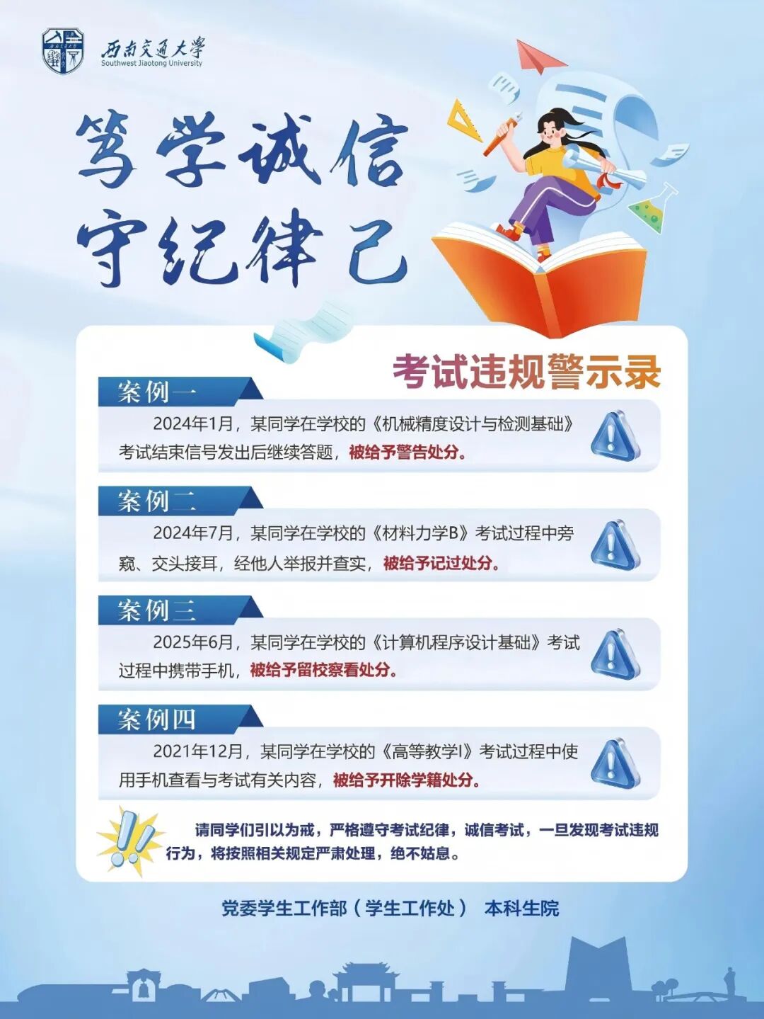 “人无信不立,学无诚不成。”诚信是立身之本,纪律是秩序之基。期末已至,考试将近,为传承我校“严谨治学,严格要求”的优良传统,严肃考风考纪,营造公平公正的考试环境,特向全校同学发出以下倡议: