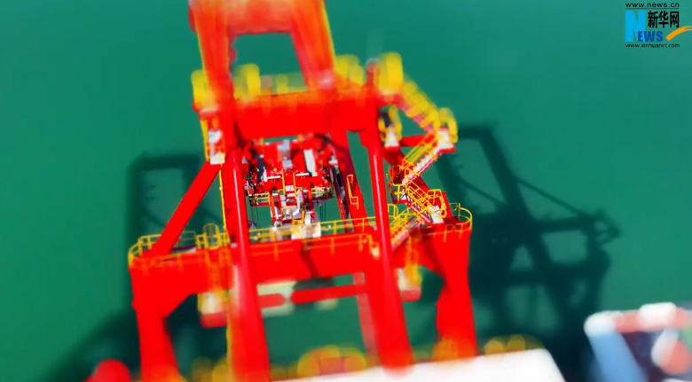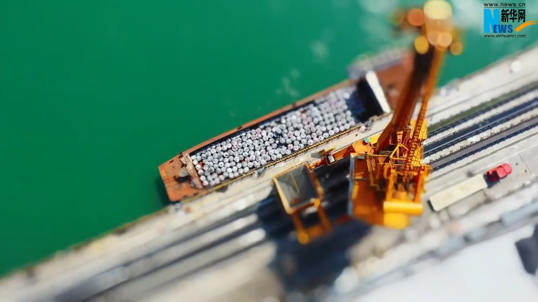 往来穿梭的火车、港区内的车辆以及正在作业的码头起吊架,在镜头之中以“微缩积木”般的精巧模样,展现出蓬勃的活力。
