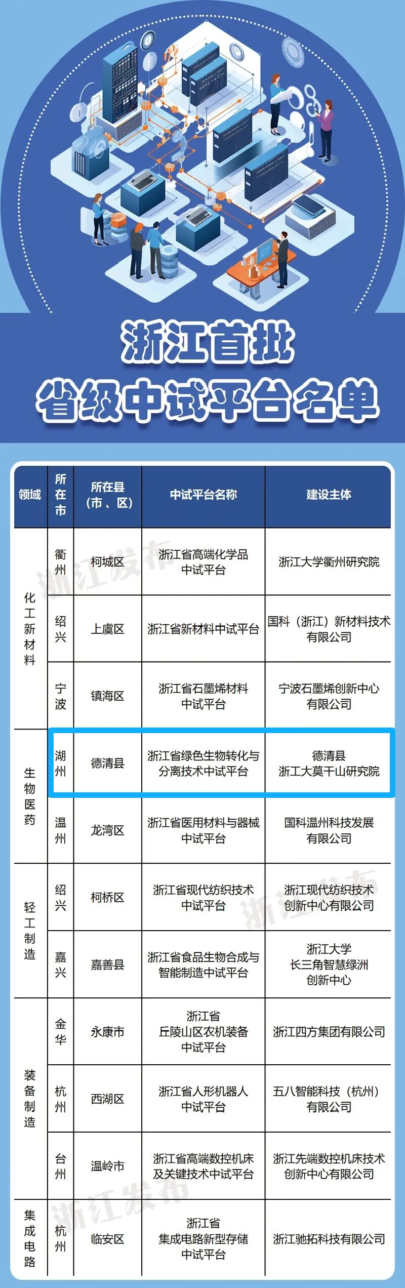 近日,浙江省经济和信息化厅与省财政厅联合发布了首批省级中试平台名单,全省共11个平台入选,湖州市有1个平台成功跻身其中。