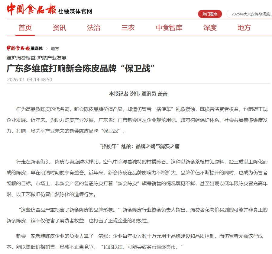 《中国食品报》聚焦:广东多维度筑牢新会陈皮品牌守护屏障