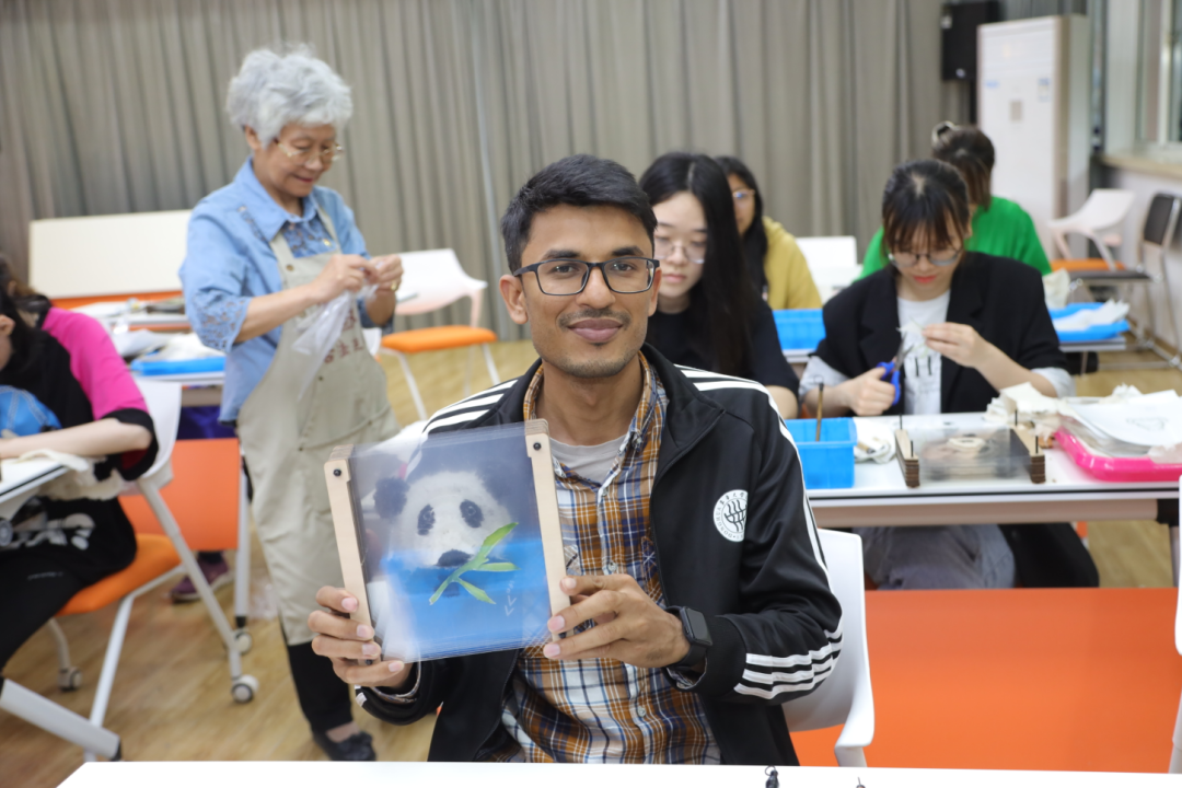华东理工大学国际学生文化实践基地自2023年在凌云社区挂牌以来,已累计开展各类实践活动50余场,服务和辐射中外青年300余人次。参与者不仅有来华攻读学位的国际学生,还包括短期来访的海外群体,比如全球首家科创孔子学院的学生代表。在基地里,国际学生围绕古法造纸延伸出熊猫纸艺、饾版印刷、书签制作、纸艺台灯等一系列创作,在动手实践中加深对中华优秀传统文化的理解。