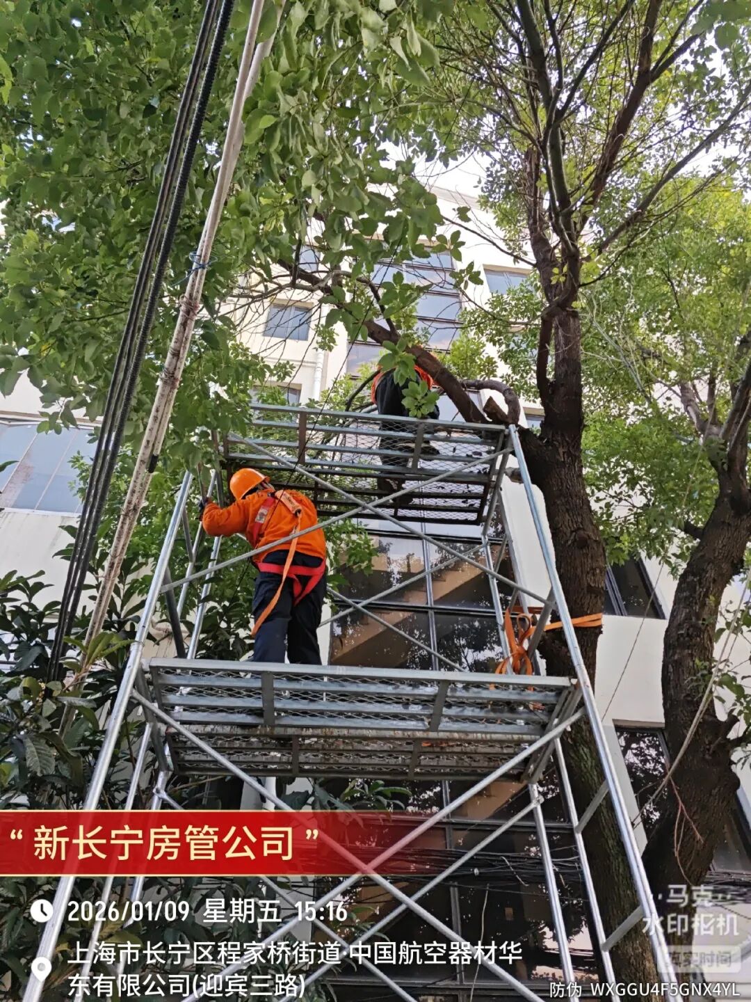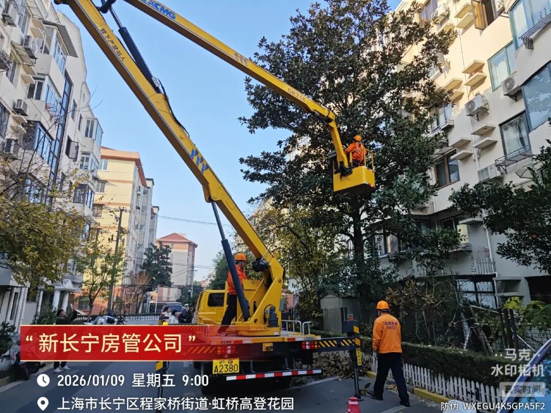 1月9日施工当天,三方联动形成强大工作合力:新程物业负责现场车辆调度与秩序维护,确保施工期间小区通行顺畅;上航新村居委会工作人员耐心向居民讲解施工流程,重点做好底楼居民的安抚协调工作,消除大家的顾虑;房管公司应急中心的专业团队凭借精湛技术,高效完成修剪作业。经过一天紧张有序的施工,扰民的大树全部修剪完毕。