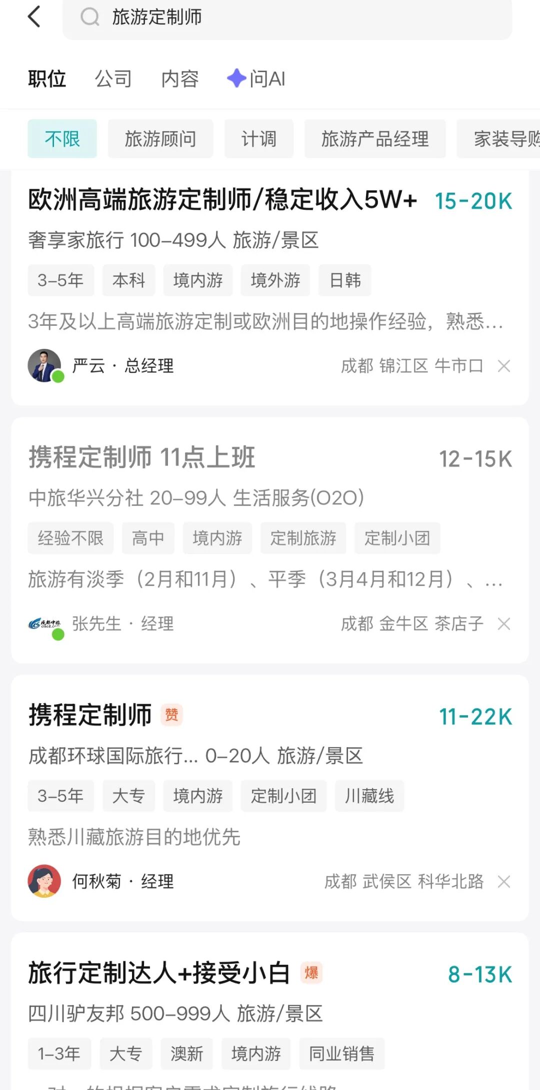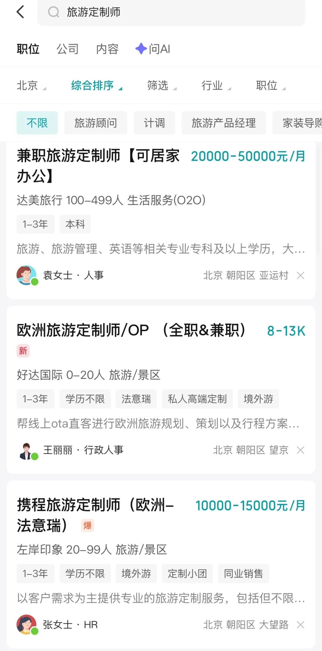 在各大招聘平台上,旅游定制师、旅行规划师、旅游顾问等相关岗位常年处于招聘状态,覆盖范围极为广泛——从北上广深这样的一线城市,到三四线小城,都能看到这类岗位的身影。其需求量更是不容小觑,仅携程一家企业,就在2023年公布过一项招聘计划:联合平台上的1500家供应商,共同招聘1万名旅游定制师。