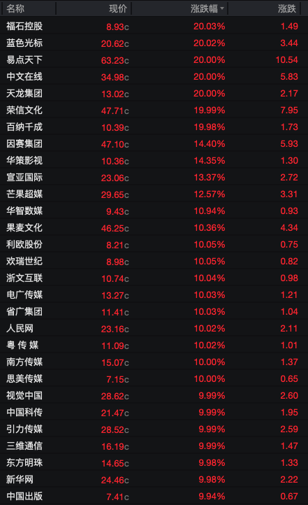 A股市场中,福石控股、蓝色光标、易点天下、中文在线、天龙集团、荣信文化、百纳千成等股票以20cm涨停;华智数媒、果麦文化、利欧股份、欢瑞世纪、浙文互联、电广传媒、省广集团、人民网、粤传媒、南方传媒、思美传媒、视觉中国等股票也纷纷涨停。
