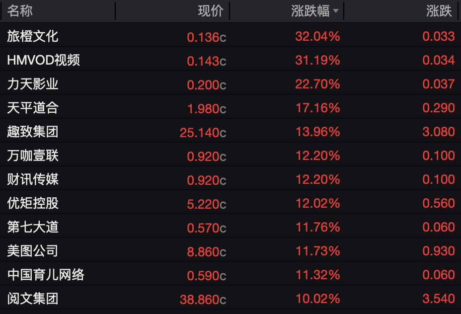 港股市场中,旅橙文化上涨32.04%,HMVOD视频上涨31.19%,力天影业上涨22.7%,天平道合上涨17.16%;趣致集团、万咖壹联、财讯传媒、优矩控股、第七大道、美图公司、中国育儿网络、阅文集团等股票涨幅超过10%。