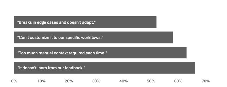 报告精准指出,这些工具失败的核心问题在于缺乏“学习能力”。多数企业级AI系统无法留存用户反馈、不能根据上下文自适应调整,也无法随时间灵活更新。