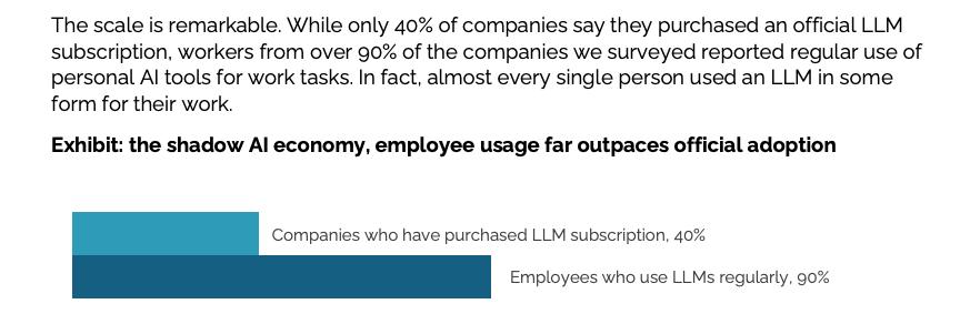 换句话说,员工层面的AI使用率是企业正式采纳率的两倍多。如果把公司自有AI工具比作“阳光下的存在”,那员工的个人账号、自行开发的小工具就成了阳光下的“影子”。