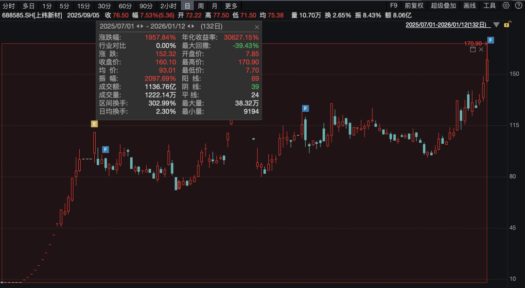 2025年7月1日至今,上纬新材股价累计涨幅接近2000%。截至1月12日收盘,该股上涨超11%,报160.1元/股。