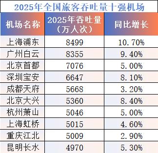 时代周报记者梳理全国200多个机场2025年旅客吞吐量走势发现,过去一年全国旅客吞吐量前十强名单未有变化,不过在具体名次上有所变动。