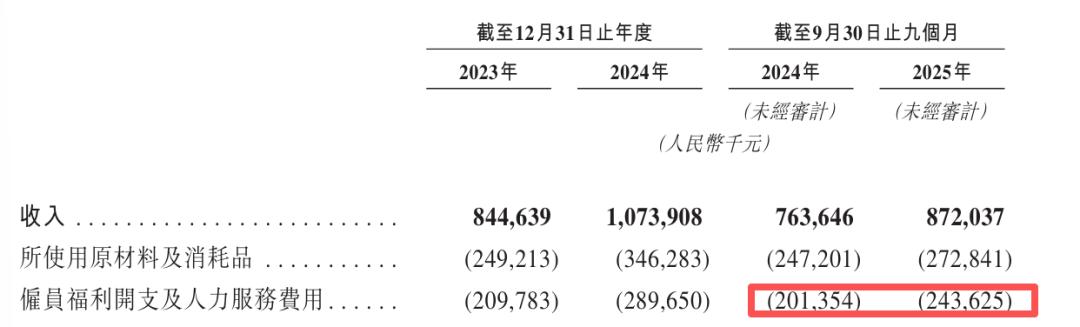 首先是人力成本的显著攀升。招股书数据显示,餐厅雇员福利开支及人力服务费用2025年前三季度达到了2.43亿元,增速接近21%,高于同期14.19%的营收增速。