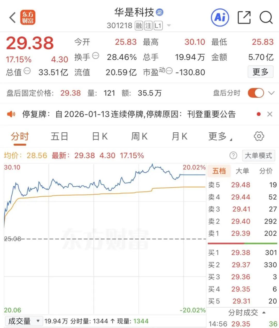 1月12日当天,华是科技股票开盘后便大幅上涨,盘中一度触及20%的涨停板。截至当日收盘,公司股价上涨17.15%,报收29.38元/股,创下近一年来的新高,最新市值为33.51亿元。