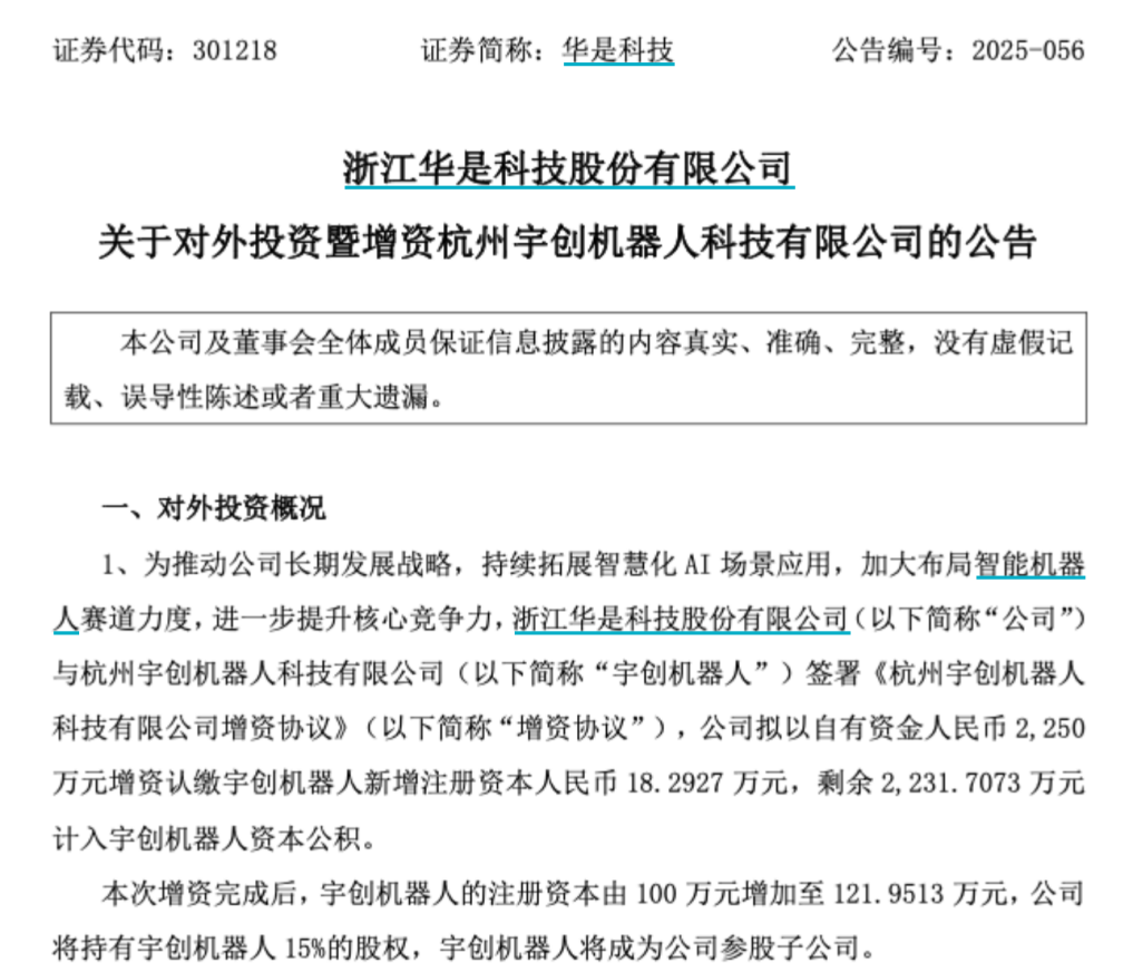 值得关注的是,在此次控制权变动事项披露的2个月前,华是科技曾发布公告,宣布以2250万元自有资金对杭州宇创机器人科技有限公司进行增资,从而获得该公司15%的股权。