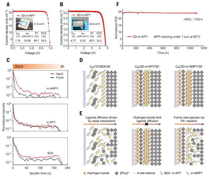 2D-m-APY修饰的钙钛矿太阳能电池在1.1 cm²面积上效率达25.4%,6.8 cm²组件效率为24.2%;耐热性优异,85°C老化1200小时后效率仍超84%。