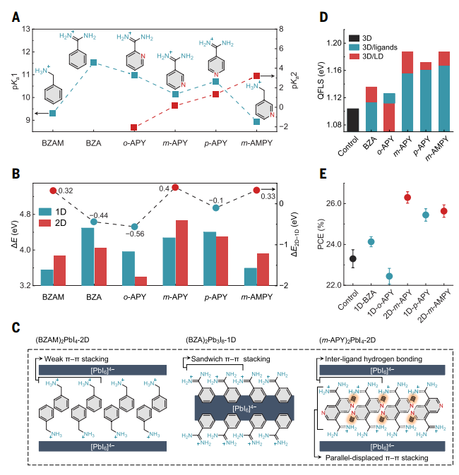 借助DFT计算与实验研究发现,多价脒基配体可通过氢键与π-π堆叠的竞争作用调控钙钛矿维度,其中m-APY能形成2D结构,化学稳定性显著提升。