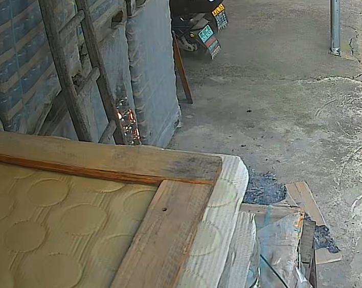 监控还原:随风飘移的烟头引燃门外货物