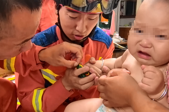 消防员一边不停地安抚婴儿的情绪,一边用工具慢慢撑开玩具,成功将婴儿的手指取了出来。