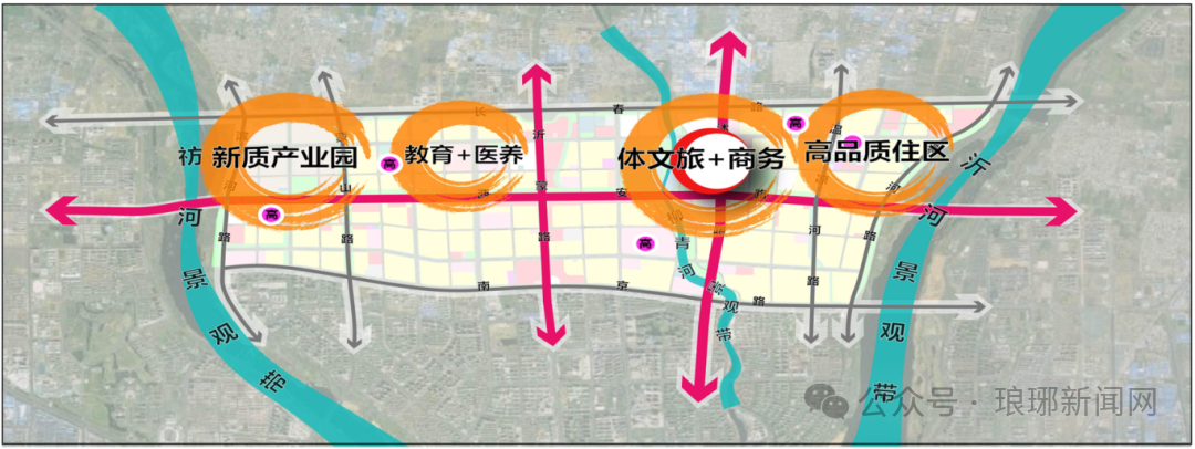 规划构建了"一心、三轴、三带、四个板块"的空间结构。其中,"一心"指奥体商业中心;"三轴"包括沭河路商业发展轴、沂蒙路商业发展轴、西安路生活休闲景观轴;"三带"涵盖沂河景观带、祊河景观带、柳青河景观带;"四板块"分别为新质产业园、高品质住区、体育+商业融合区、医养康养区。