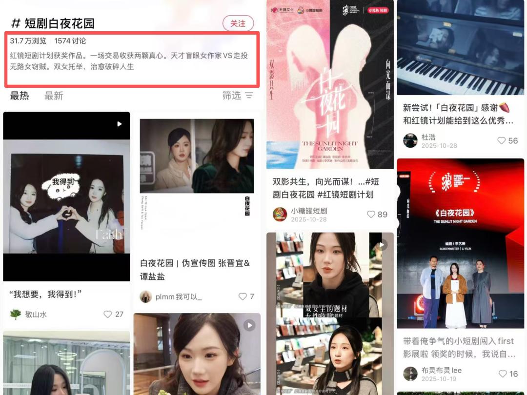 治愈系短剧《白夜花园》因符合用户审美趣味,讨论度攀高,“短剧白夜花园”话题下超31.7万浏览、1574讨论,实现二次传播。