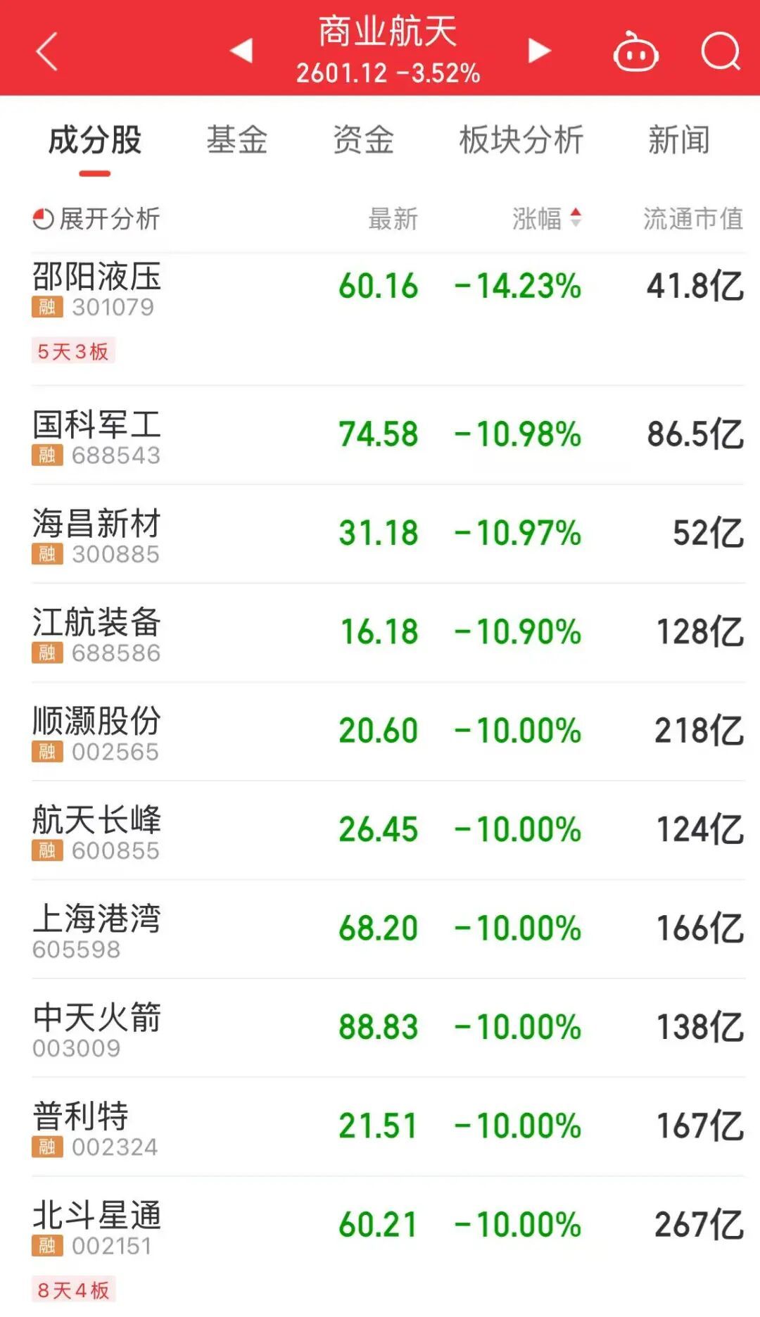 今日上午,商业航天板块震荡加剧,个股跌幅榜前列多为商业航天概念股。