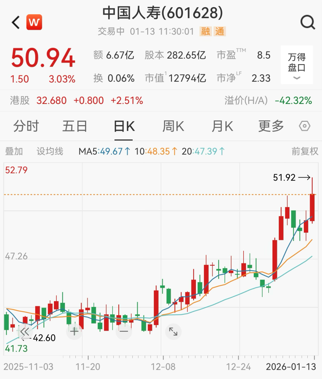 个股方面,中国人寿涨幅超3%,当前股价为50.94元/股,最新市值达到12794亿元。