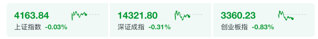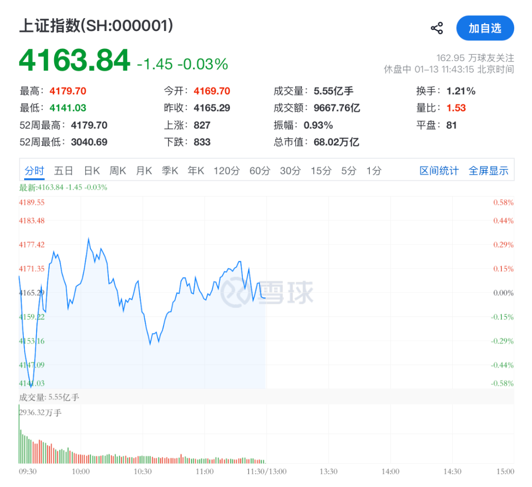 1月13日上午,A股三大股指呈现集体下行态势。截至午间收盘,上证指数报4163.84点,微跌0.03%;深证成指下跌0.31%;创业板指跌幅相对较大,为0.83%。