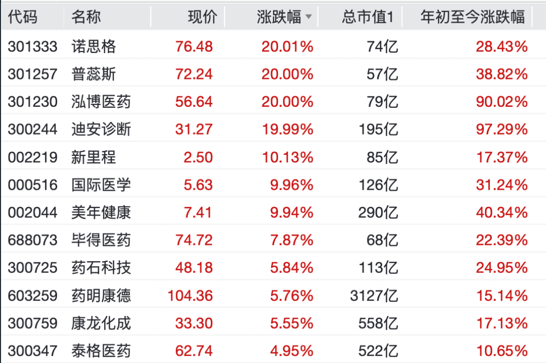 个股方面,迪安诊断、诺思格、普蕊斯、泓博医药均收获20cm涨停,美年健康、新里程、国际医学则收获10cm涨停。毕得医药、药石科技、药明康德等个股也纷纷上涨。