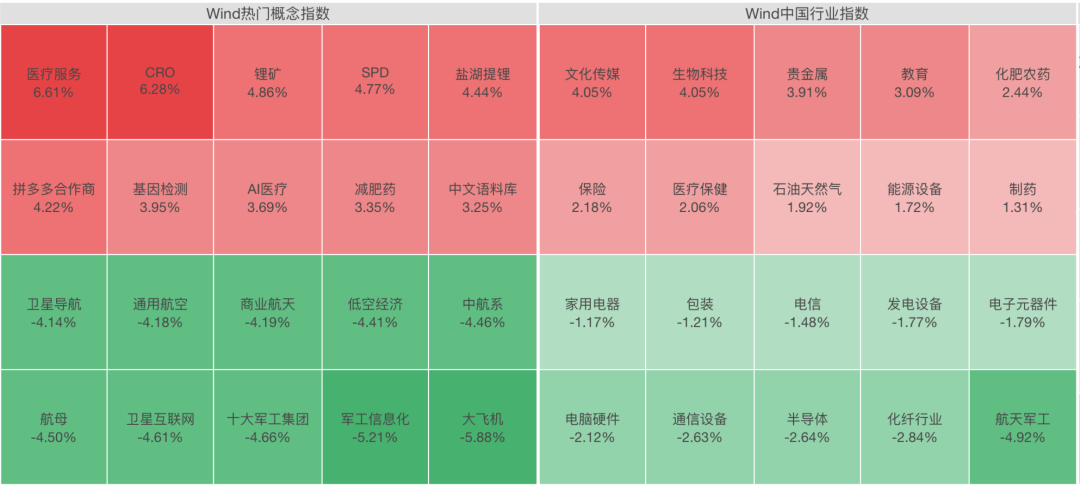 板块表现方面,医疗服务、锂矿、贵金属、保险等板块涨幅靠前,而商业航天、通信设备、船舶制造等板块则出现不同程度的下跌。