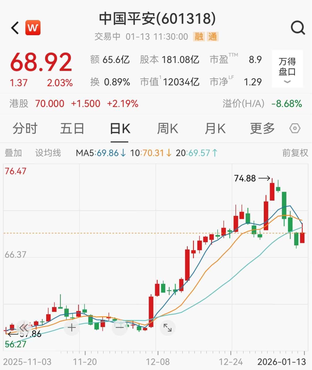 中国平安涨幅超2%,当前股价为68.92元/股,最新市值为12034亿元。