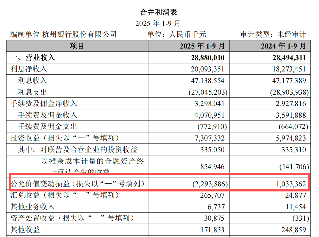 营收下滑主要受非息业务影响。受去年债市利率上行影响,债券估值收益缩水,杭州银行前三季度公允价值变动损益为-22.94亿元,而2024年同期为正收益10.33亿元。