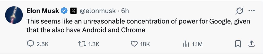 消息一出,马斯克便在社交平台X上发文表示:“考虑到谷歌还拥有安卓系统和Chrome浏览器,这种技术权力的集中化似乎不太合理。”
