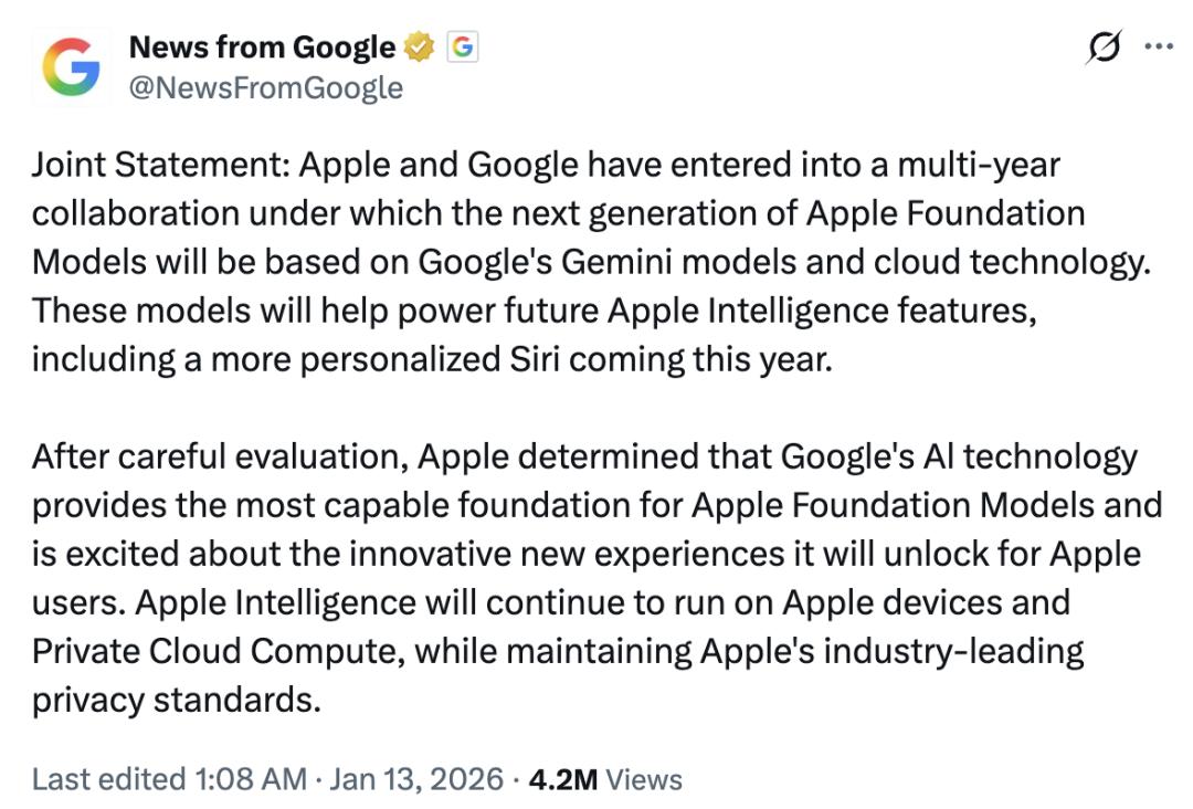 智东西1月13日消息,今日凌晨,谷歌与苹果共同发布声明,宣布达成一项多年期的AI服务深度合作——苹果将借助谷歌的Gemini模型及云技术来构建自身的基础AI模型。这两家曾在操作系统领域激烈竞争的科技巨头,在AI时代出人意料地选择了携手。