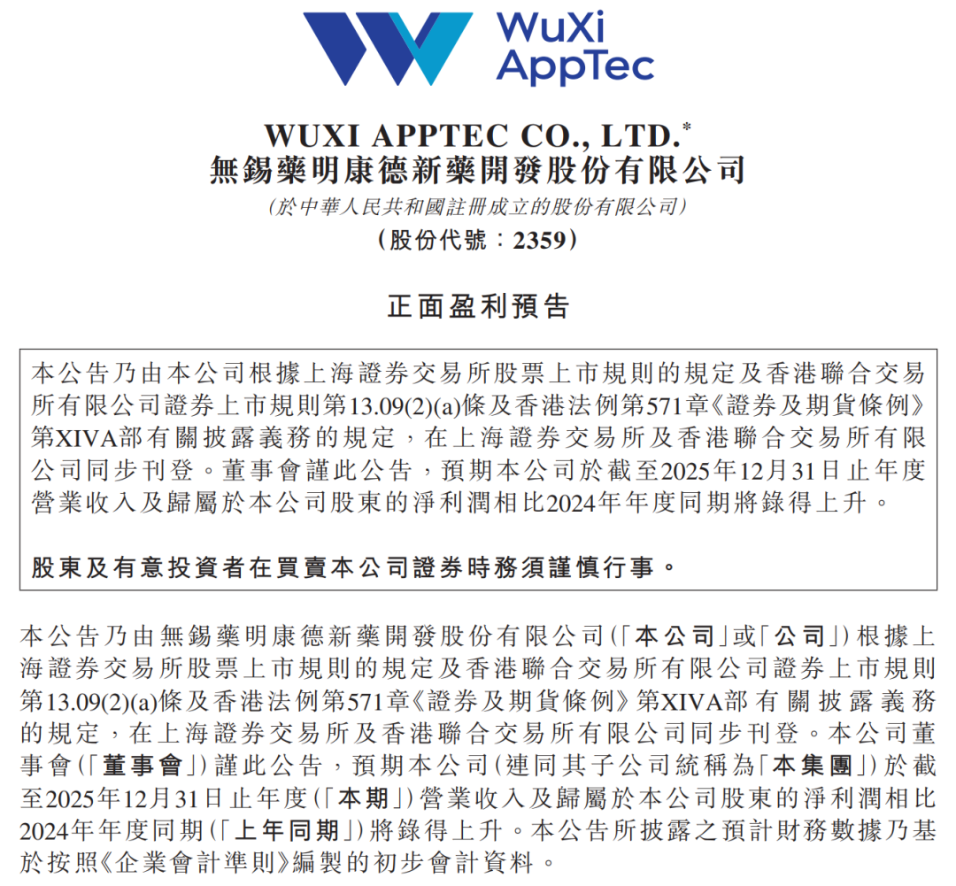 根据药明康德1月12日发布的《正面盈利预告》,公司2025年度预计营业收入约454.56亿元,同比增长15.84%,其中持续经营业务收入同比增长21.40%;经调整归母净利润约149.57亿元,同比增长41.33%;扣非归母净利润约132.41亿元,同比增长32.56%;归母净利润约191.51亿元,同比增长102.65%;利润总额约239.06亿元,同比增长107.16%;基本每股收益约6.70元/股,同比增长104.27%。