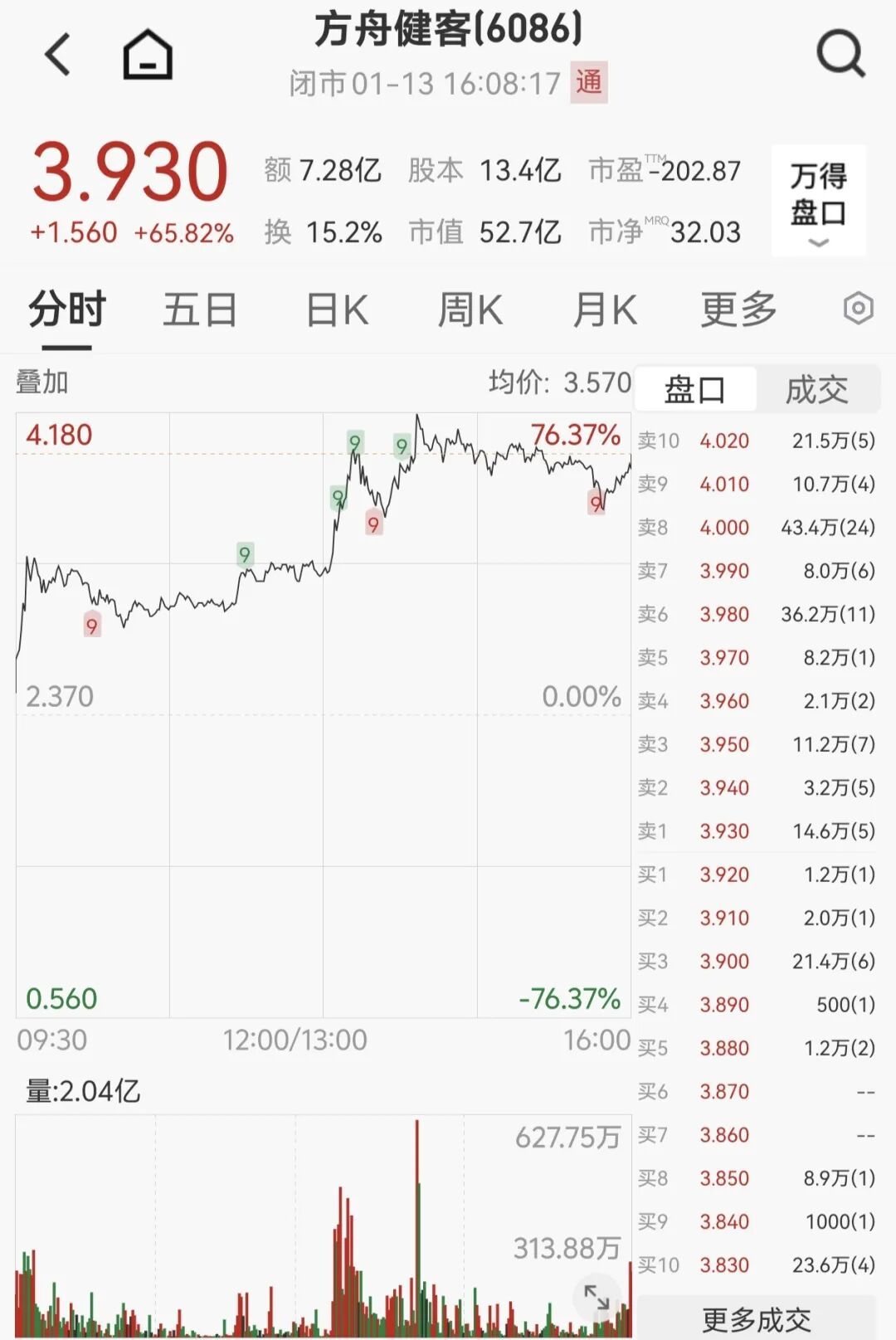 方舟健客在1月13日开盘后走势强劲,最高涨幅达76.37%,最终收于3.93港元/股,单日大涨65.8%。其股价飙升的核心原因是公司近期与腾讯健康合作,对数智化“AI+慢病管理”领域技术进行升级。