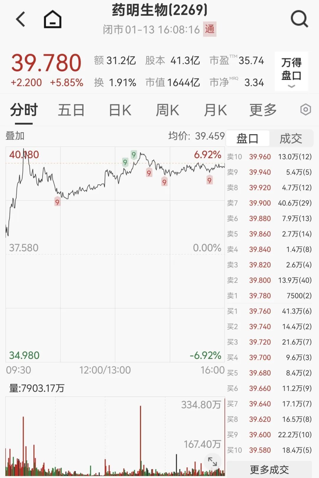 药明系的另一只个股药明生物当日同样表现出色,盘中最大涨幅达6.92%,收于39.78港元/股,涨幅5.85%,在蓝筹股涨幅中排名第二。